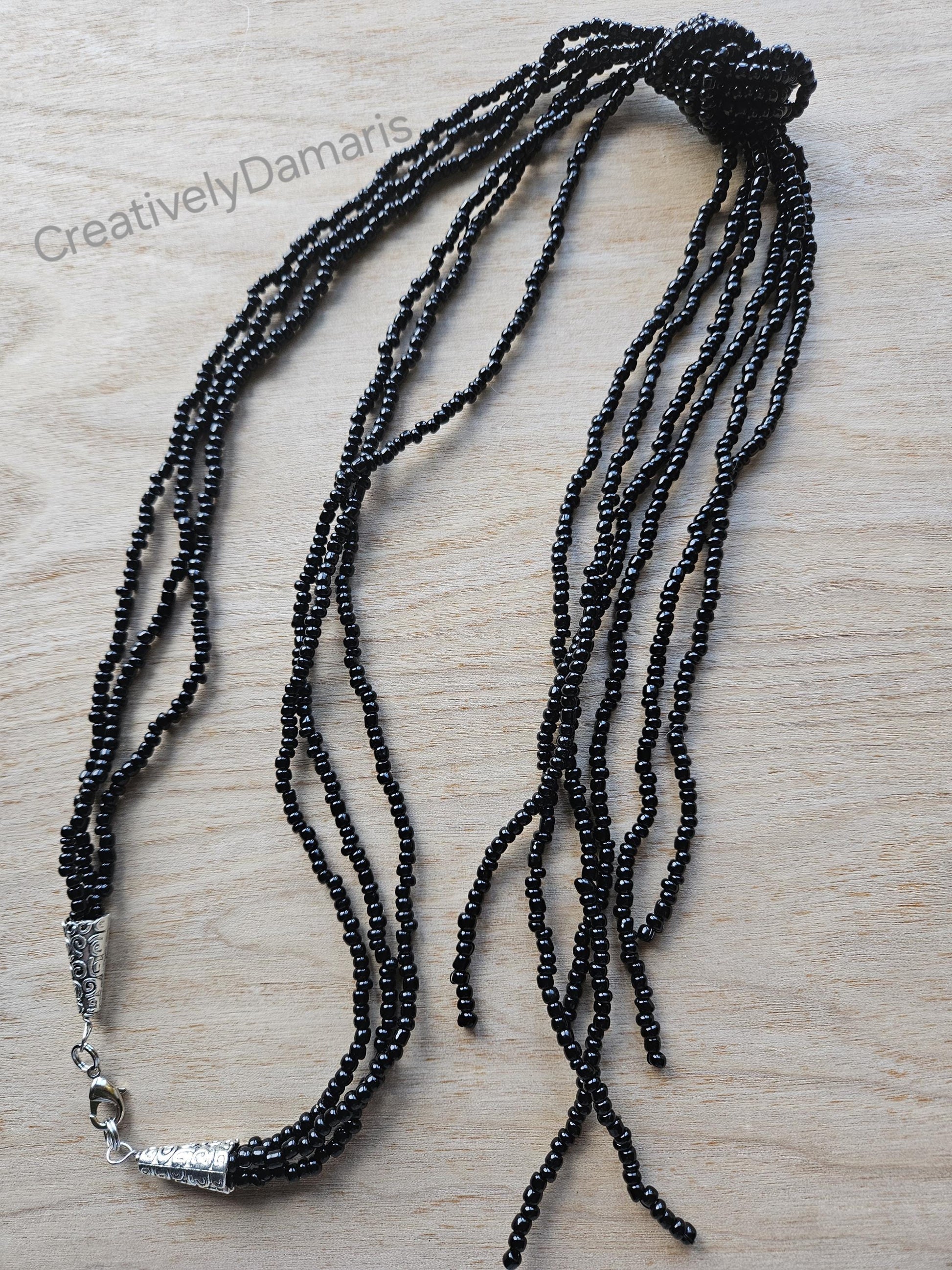 Black multi-strand beads beaded on weaving thread strands with silver plated lobster claw closure. Necklace can be knotted at desired spot. Knotted necklace length: 21 inches (53 cm) from clasp to end of longest strand.