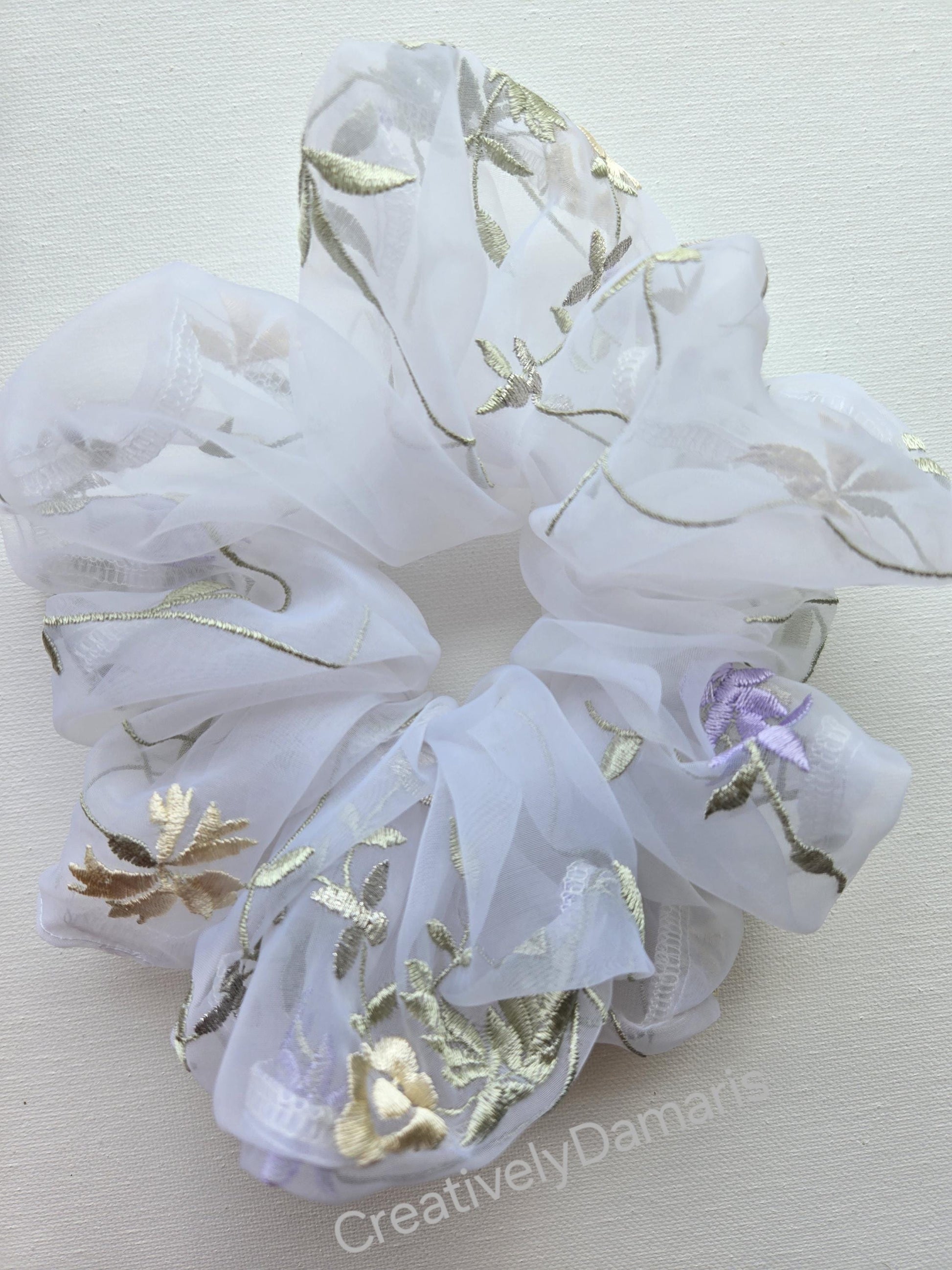 Embroidered Organza Scrunchie with Lilac Floral Print Scrunchie
