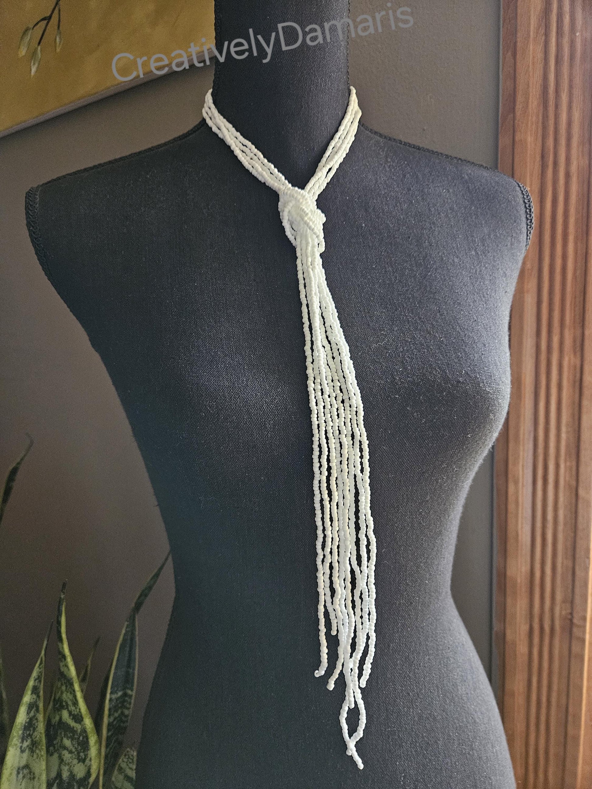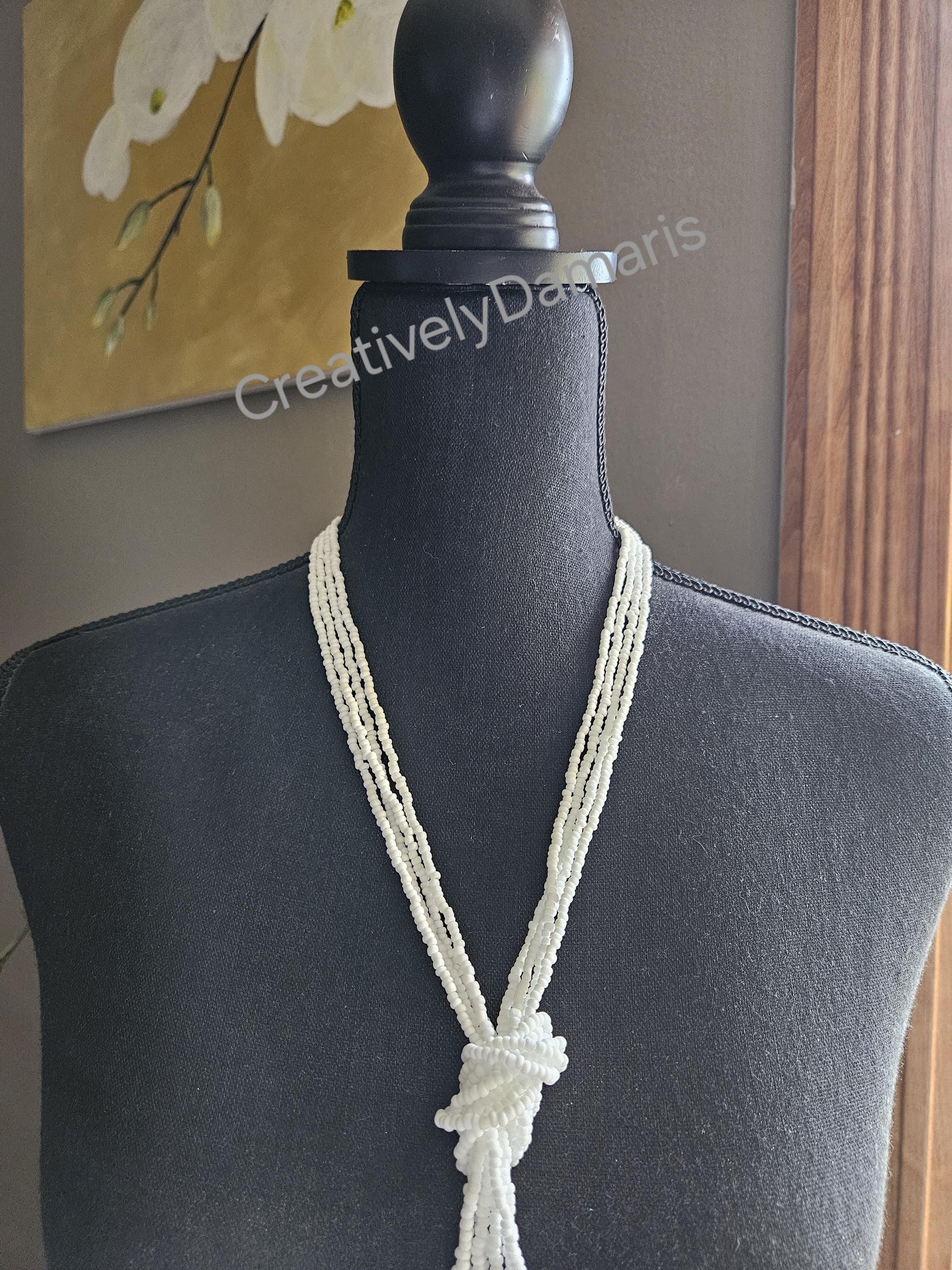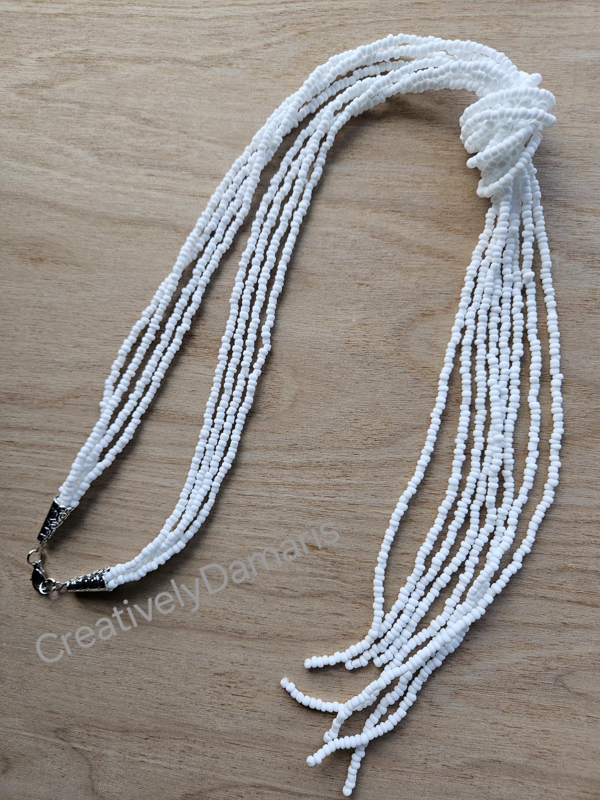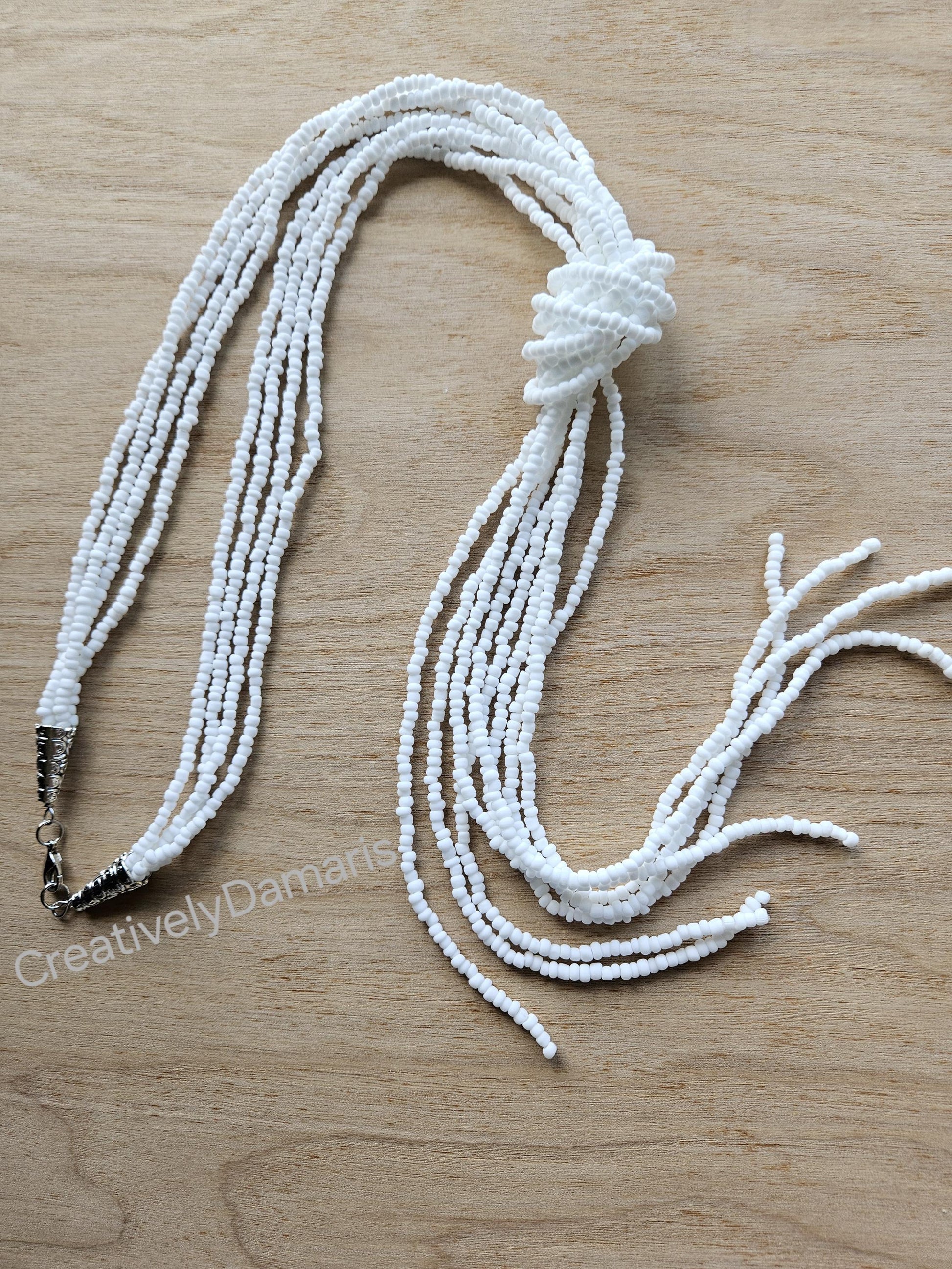 White matte multi-strand beads beaded on weaving thread strands with silver plated lobster claw closure. Necklace can be knotted at desired spot. Knotted necklace length: 21 inches (53 cm) from clasp to end of longest strand.